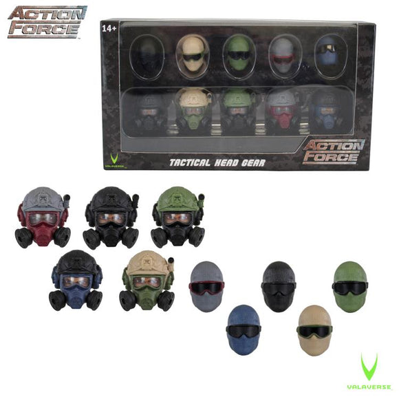 1/12 scale action figure tactical head gear! This set includes two different style heads, each in 5 different colors for a total of 10 tactical heads. These interchangeable heads fit all male Action Force figures.