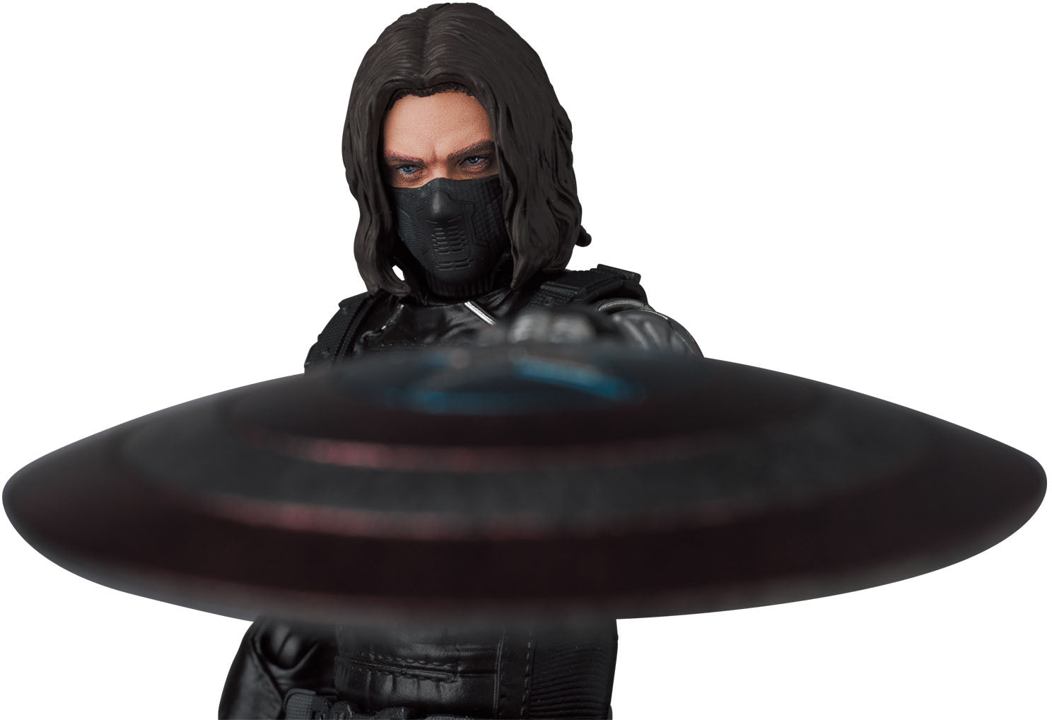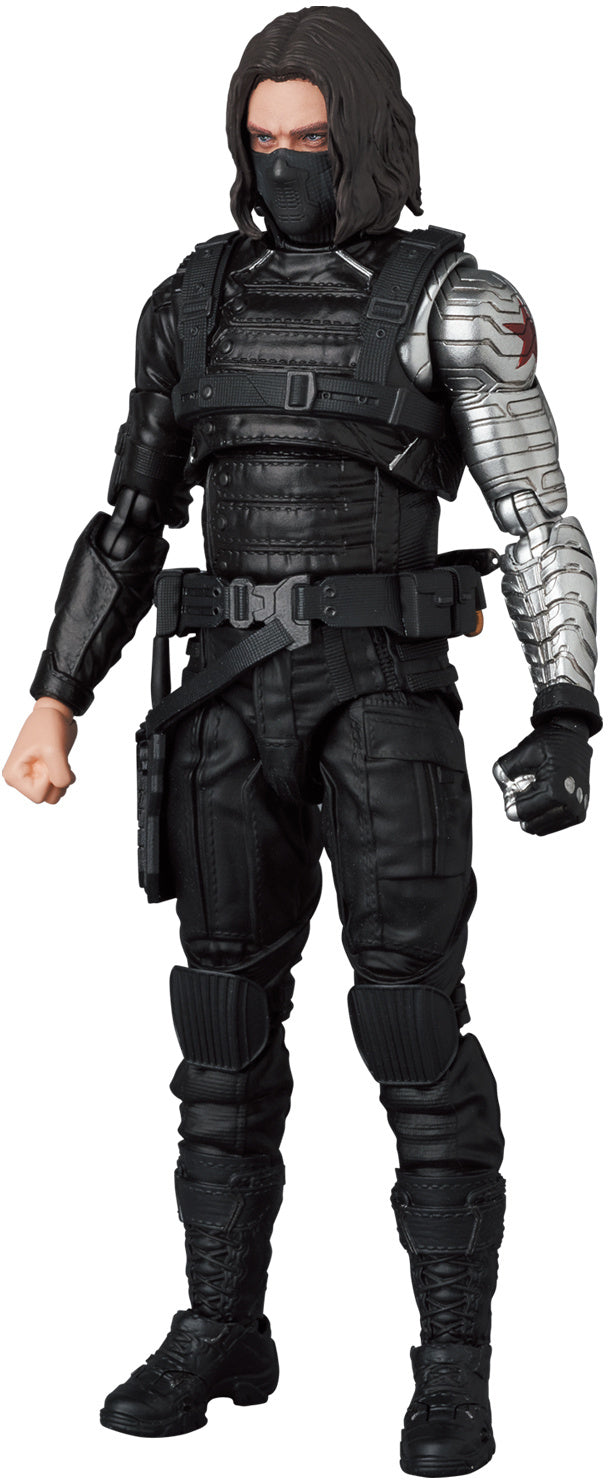 From "Captain America: The Winter Soldier" comes a MAFEX action figure of Bucky Barnes, aka the Winter Soldier! He comes with three different head parts to display him with his mask on or off, along with a shield and several knives for close hand combat. A posable figure stand is also included. Be sure to get the Winter Soldier's very first MAFEX release for your collection!