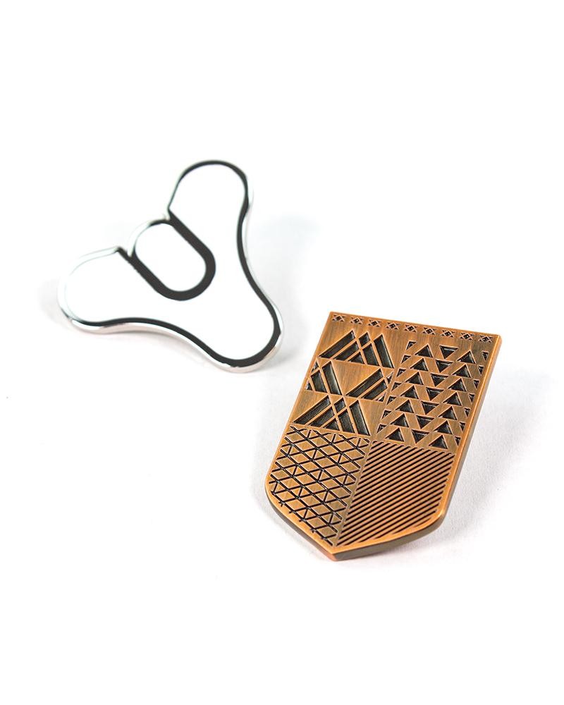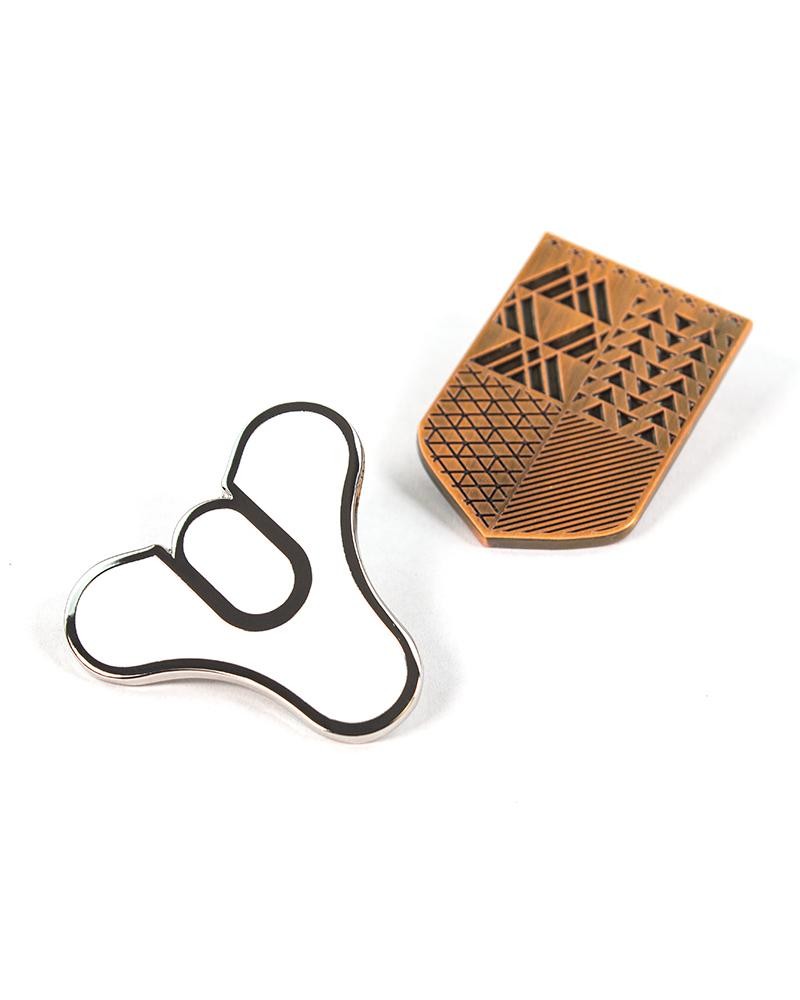 - Two premium quality hard enamel metal pins with a glossy finish featuring the Tricorn and Guardian crest designs on a backing card