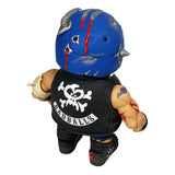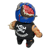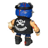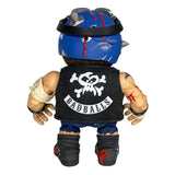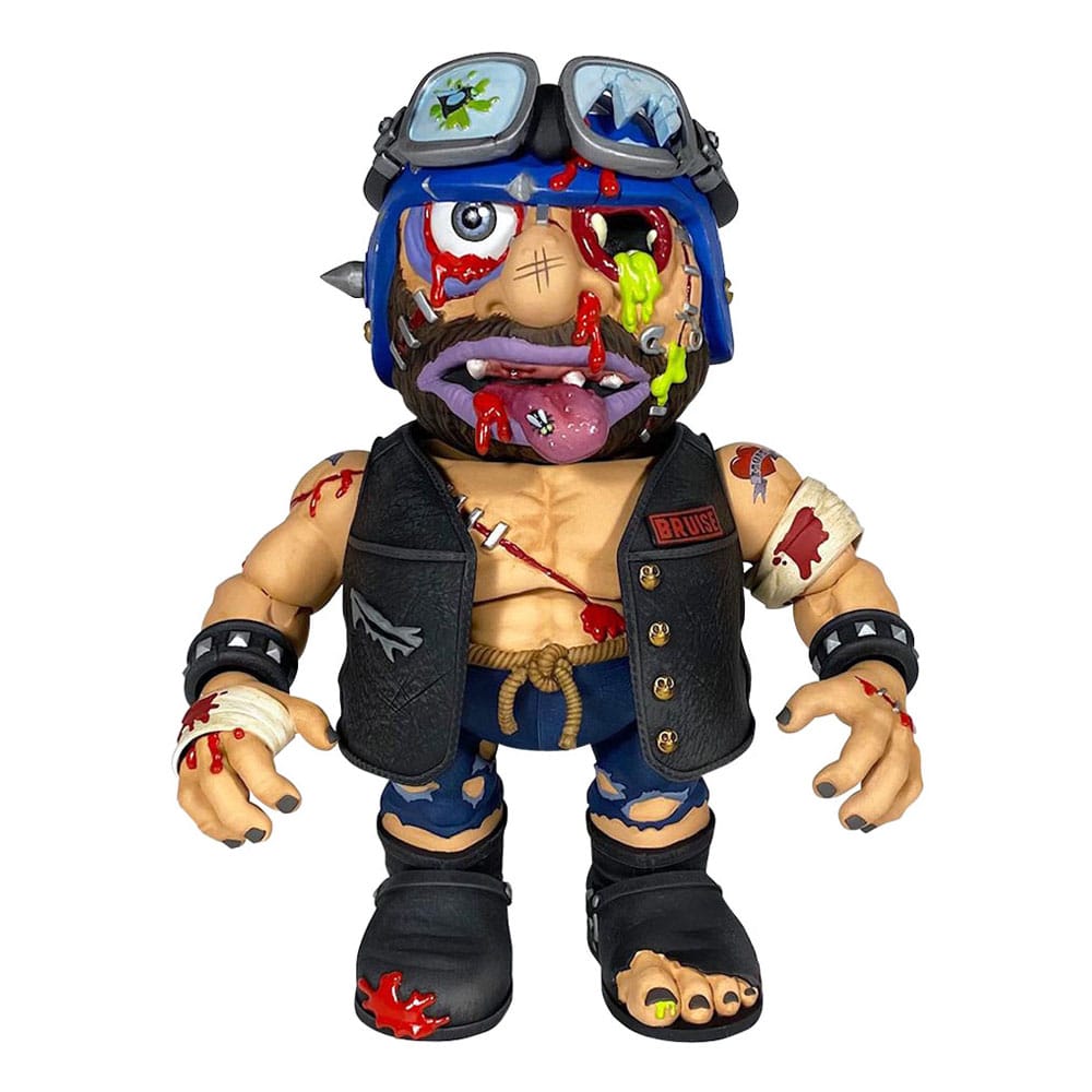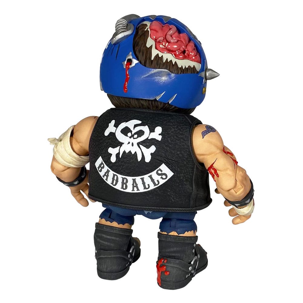 Badballs Biker Edition Bruise Brother includes removable goggles, knife with sheath, vest, bandages, and breakaway battle damage helmet panel revealing cracked skull and wormy brains!
