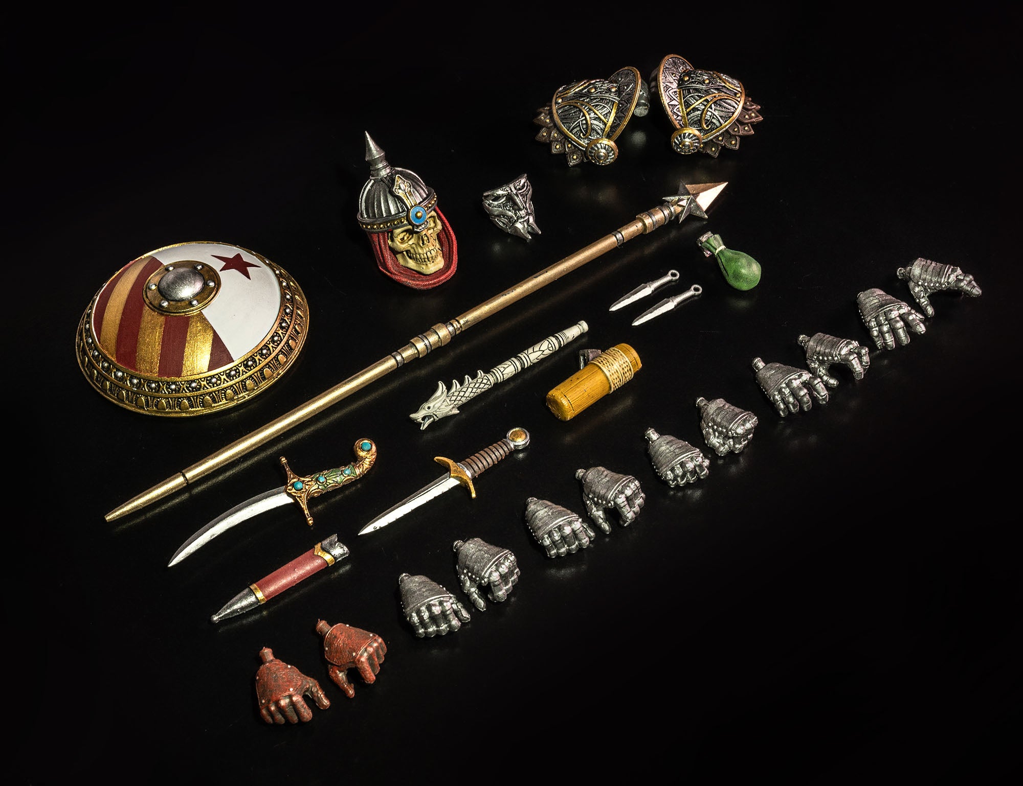 - Accessories: Schimitar with scabbard, dagger with sheath, break-apart spear, shield, blowgun, dart cannister, 2 throwing daggers, potion bottles, money pouch, 6 sets of hands