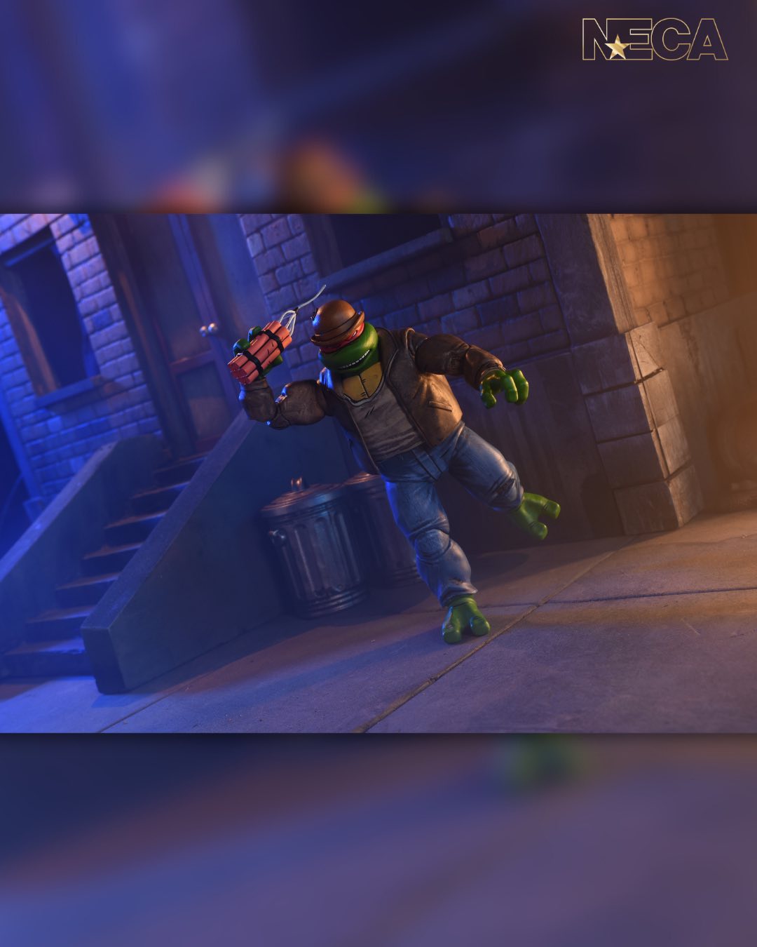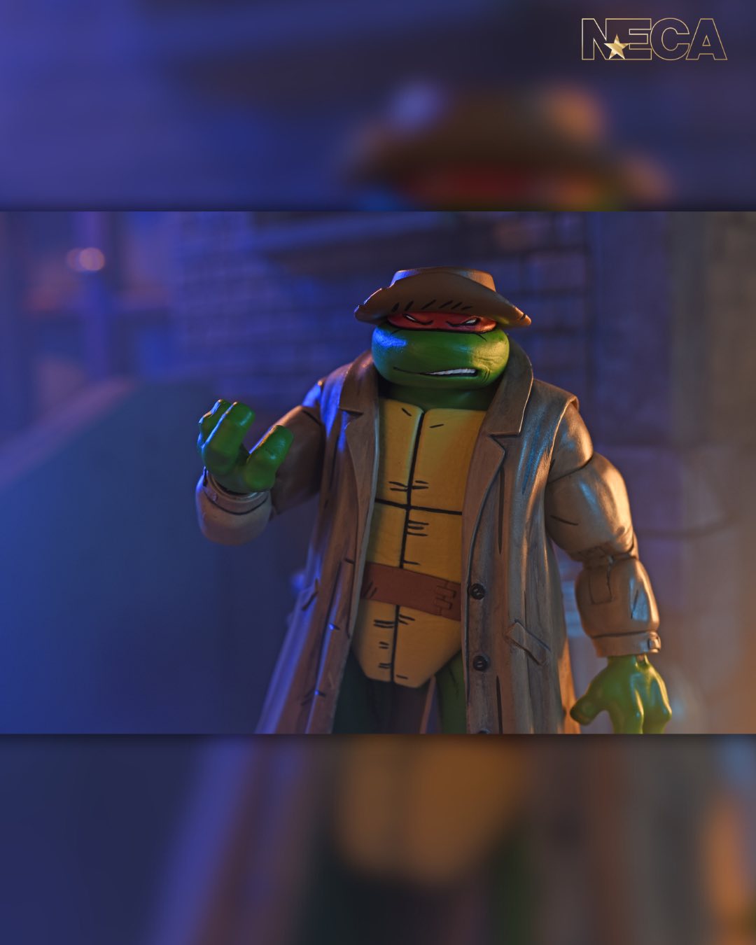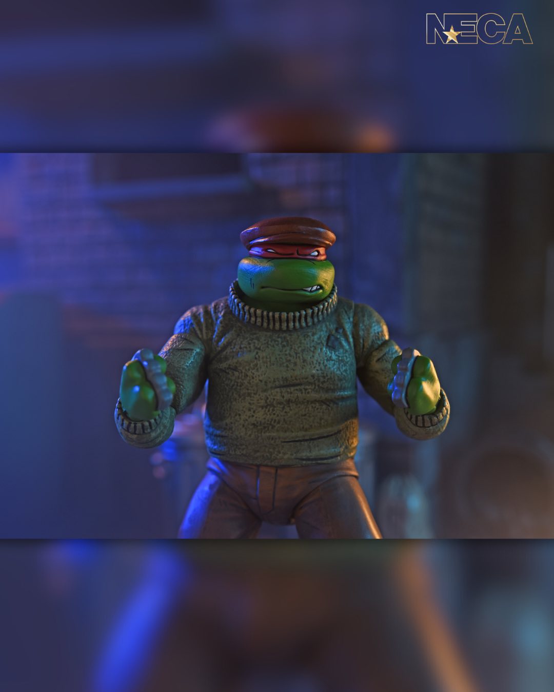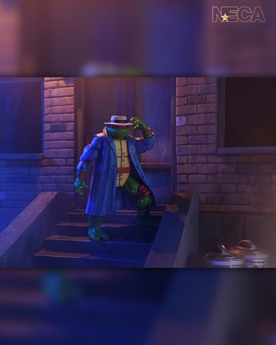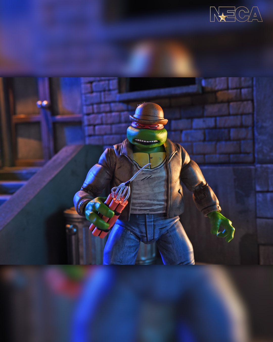 As seen in issue #14 of Eastman & Laird’s original Teenage Mutant Ninja Turtles comics from Mirage Studios! Shh… do NOT mention these figures to anyone! In search of the stolen brass cow, these Gangster Turtles are ready to join your TMNT collection. This 7-inch scale action figure set includes the whole crew—Leonardo, Donatello, Raphael, and Michelangelo—not to mention new expressions that are compatible with NECA’s previous Mirage Turtles 4-Pack (sold separately). We’d also be remiss not to mention it comes in collector-friendly packaging with amazing, original artwork by Kevin Eastman!