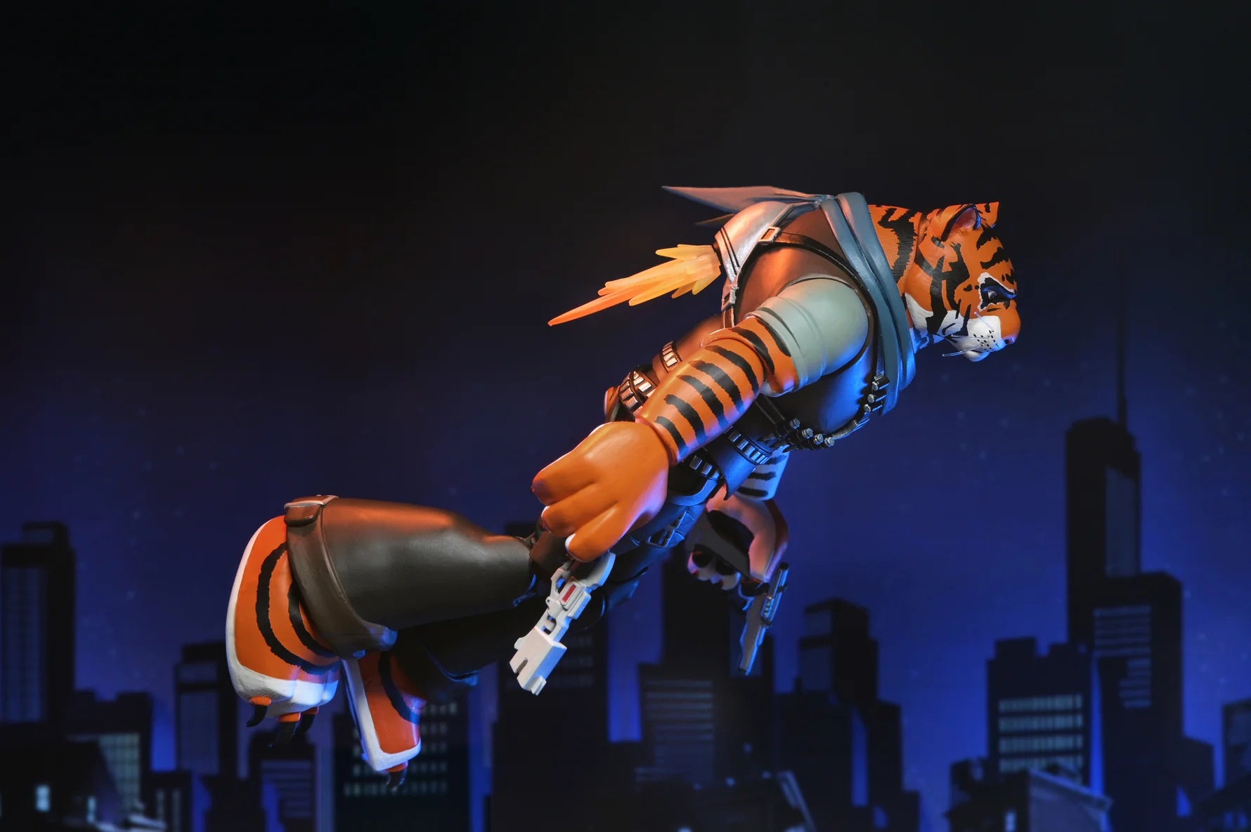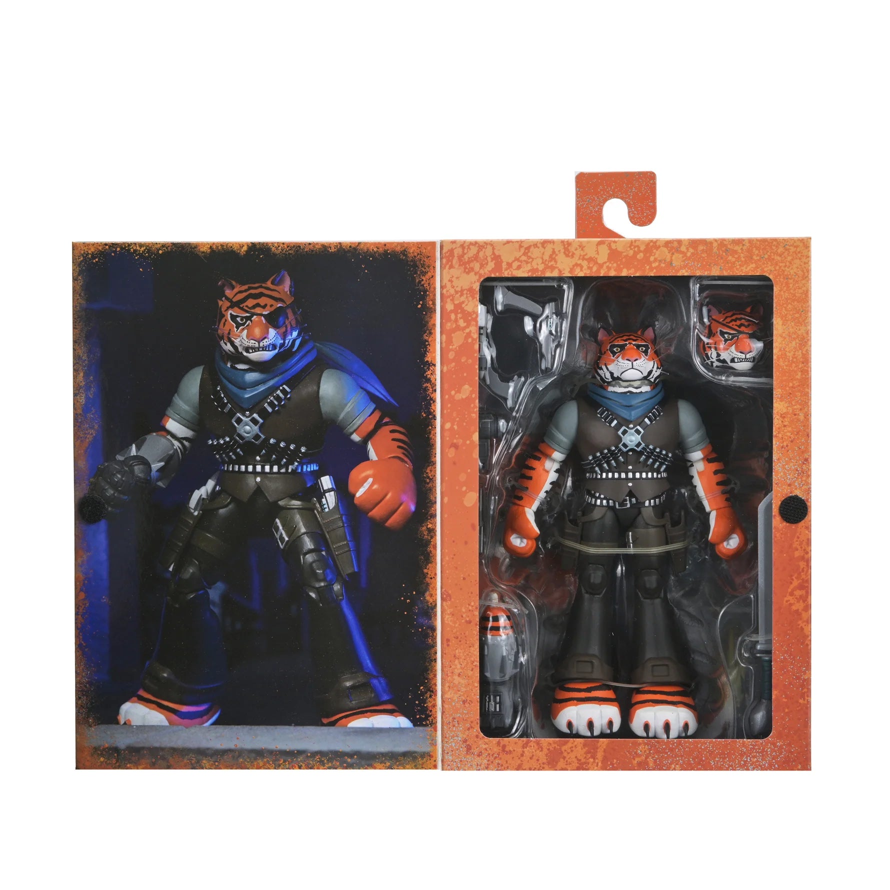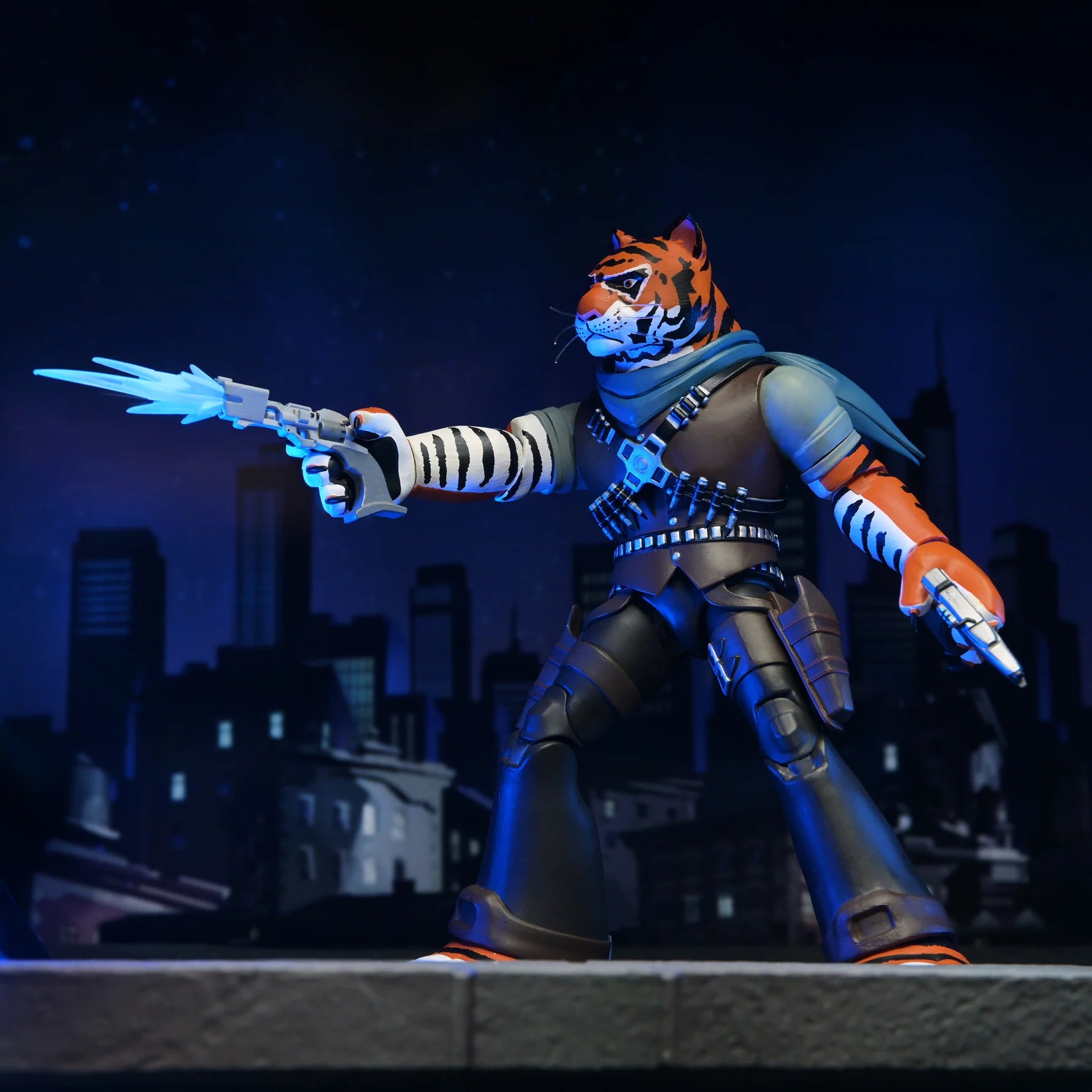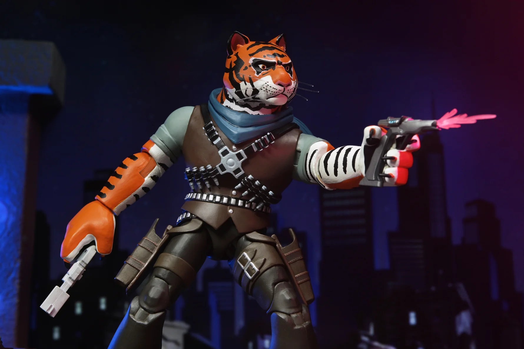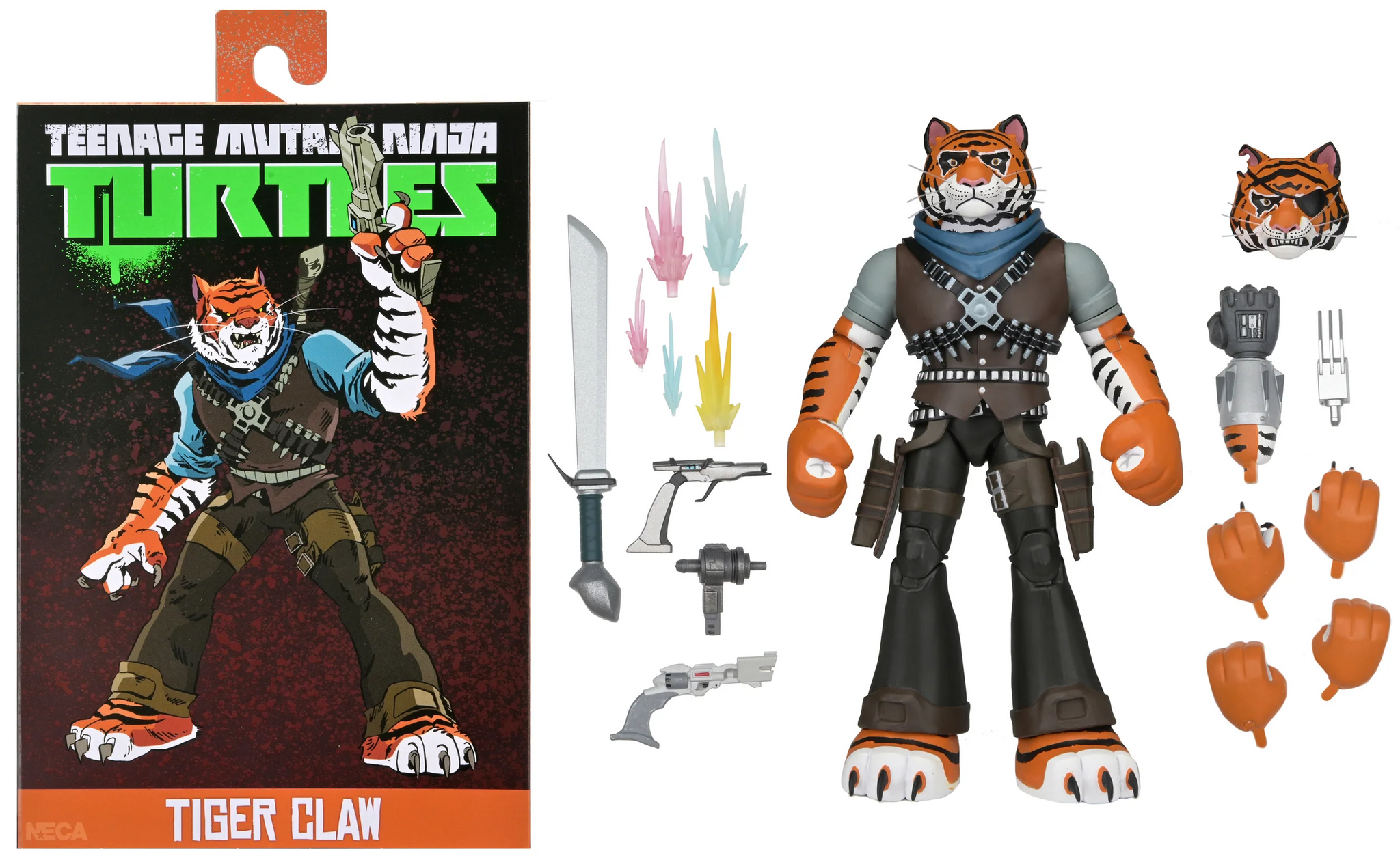 This 7-inch scale Tiger Claw figure captures the fearsome feline with incredible painted details to replicate his animated appearance. He includes an array of episode-specific accessories: interchangeable heads and hands, blasters, blast effects, machete, and interchangeable robo-arm and accoutrements. The figure comes in collector-friendly packaging with illustrations by TMNT artist Ciro Nieli.