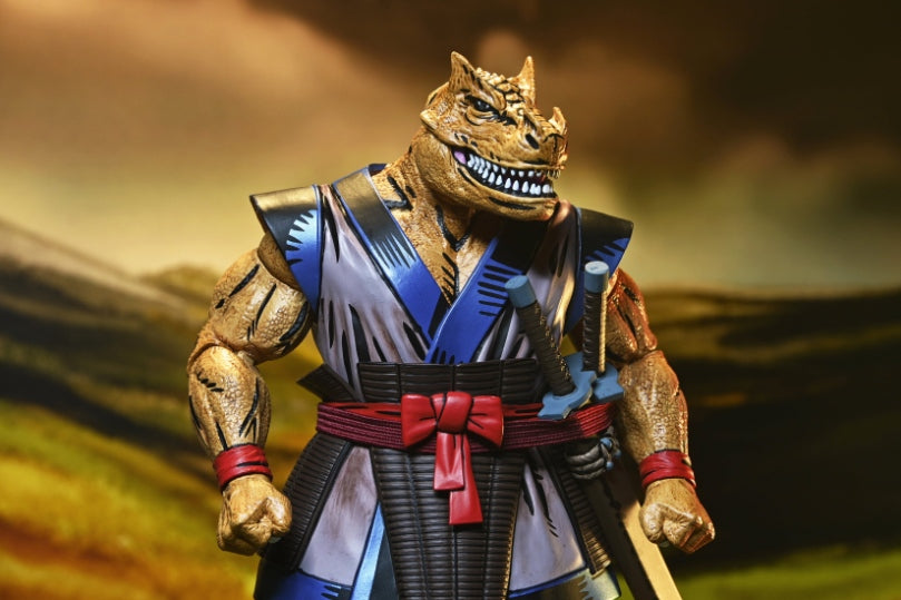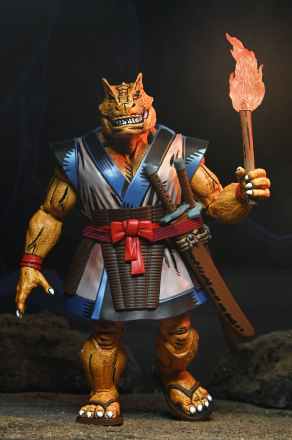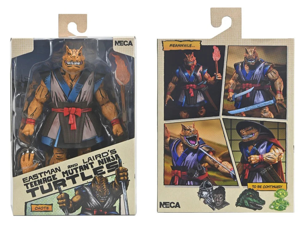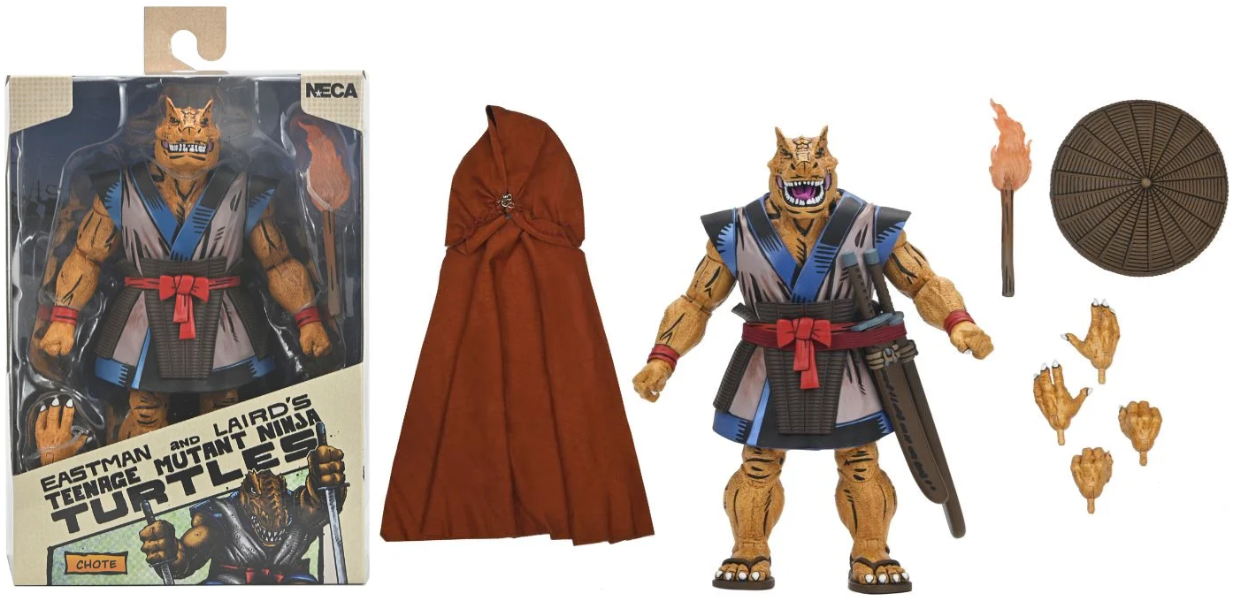 As seen in Eastman & Laird’s original Teenage Mutant Ninja Turtles comics from Mirage Studios! Chote, the mysterious, dinosaur-like creature and skilled samurai warrior, is ready to join your collection. Standing in 7-inch scale, this NECA action figure features a soft goods cape, removable hat, torch, all-new weapons, and even a hinged jaw! Comes in collector-friendly packaging with artwork by Kevin Eastman and Michael Dooney.