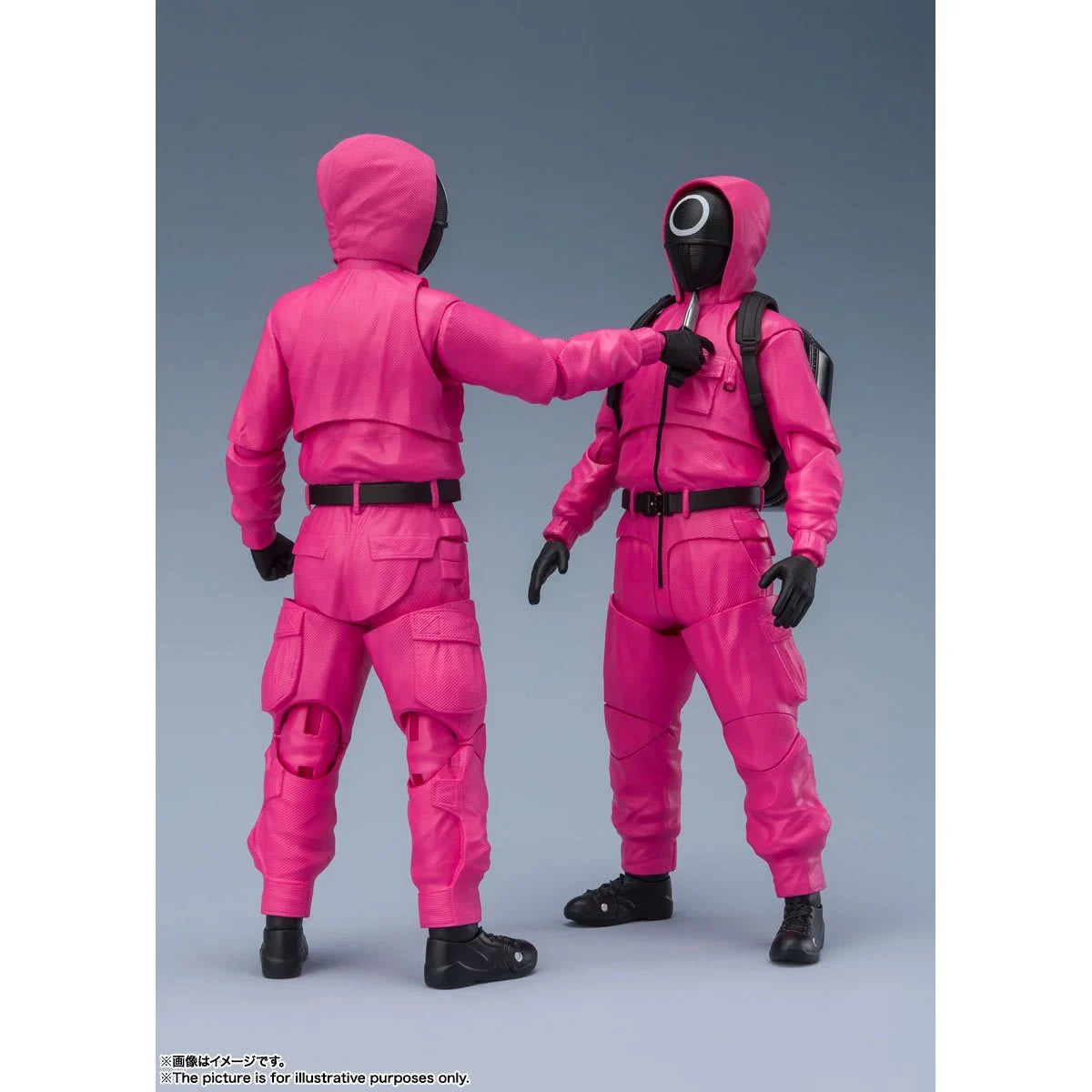 The Masked Worker / Masked Manager from the smash-hit Netflix series Squid Game joins S.H.Figuarts! The Masked Worker/Manager comes with an additional head, 3x pairs of optional hands, 1x knife, and 1x backpack. The Squid Game Masked Worker Manager S.H.Figuarts Action Figure stands about 5 3/4-inches tall and is made of plastic.