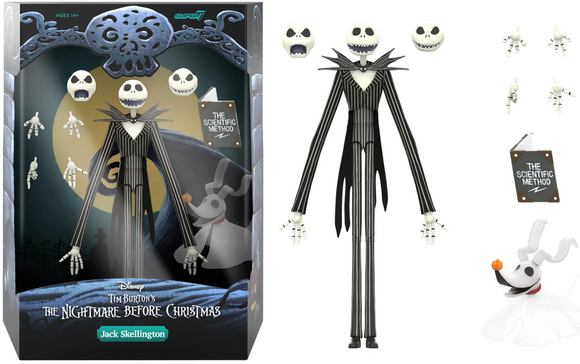 He’s a master of fright! This 7” scale highly articulated Disney Tim Burton’s The Nightmare Before Christmas ULTIMATES! figure of Jack Skellington features a soft-goods tailcoat, multiple interchangeable heads & hands, his faithful ghost-dog Zero, and “The Scientific Method” book- because there’s gotta be a logical way to explain this Christmas thing! Any Halloween (...or Christmas?) collection would be frightfully incomplete without this wave of made-to-order ULTIMATES! Figures from Disney Tim Burton’s The Nightmare Before Christmas!