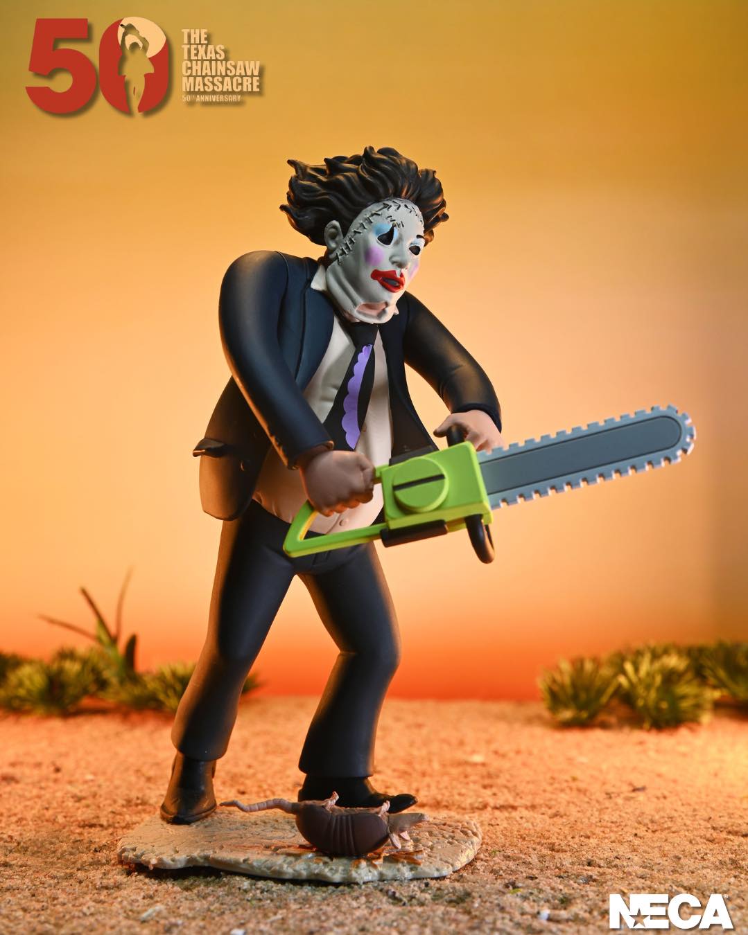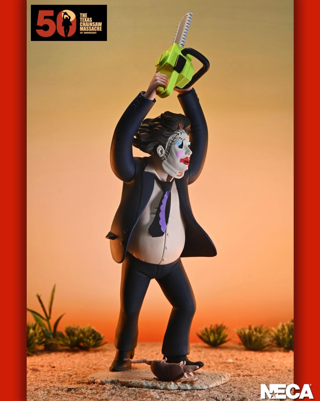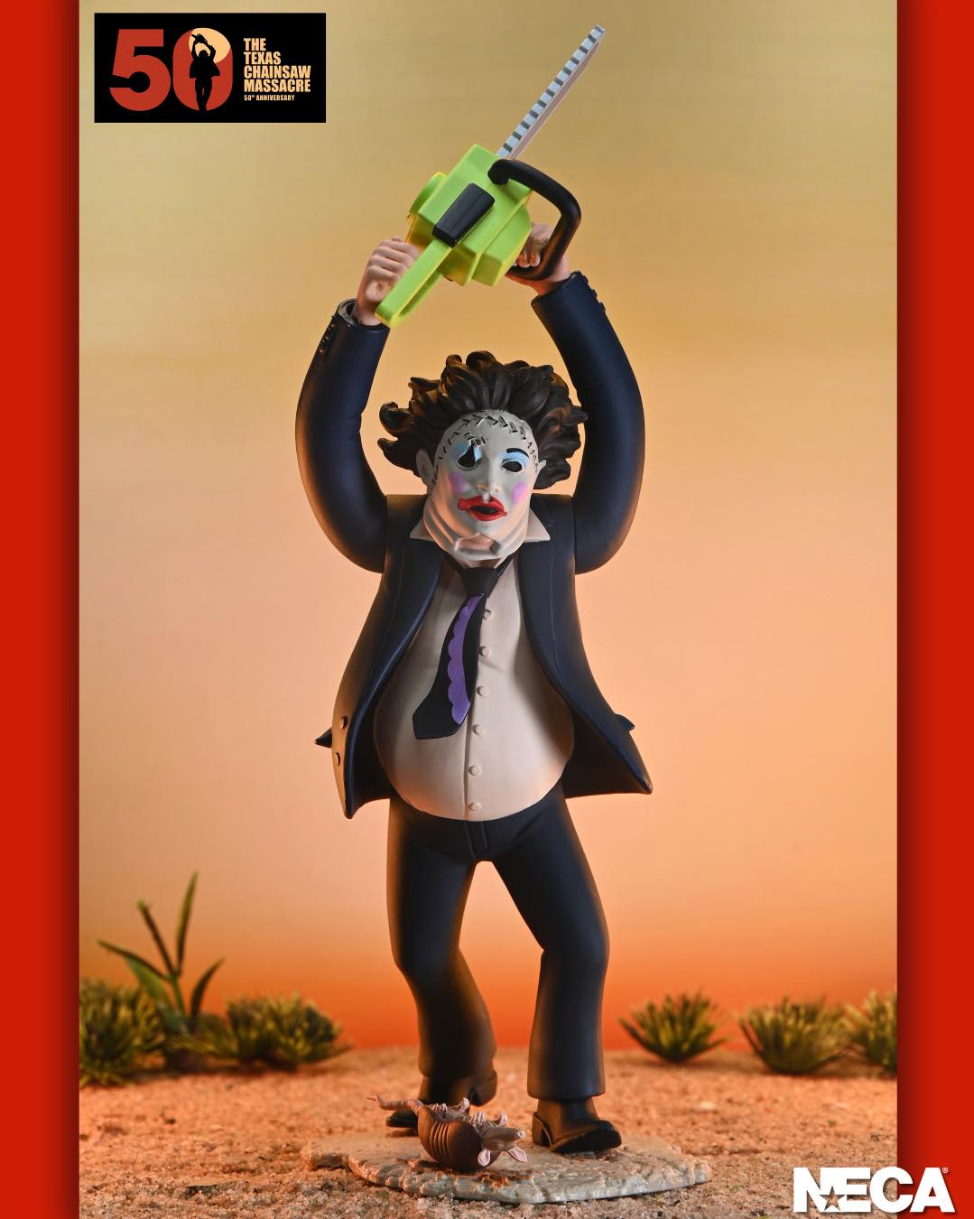 We are thrilled to kick off the 50th anniversary of the 1974 film Texas Chainsaw Massacre with this all-new Leatherface 6-inch scale action figure. This long-awaited, fan requested version of Leatherface in his “Pretty Woman” look includes an iconic armadillo display base. It comes in commemorative 50th anniversary blister card packaging with a cut-out cardback featuring original art by NECA painter Geoff Trapp.