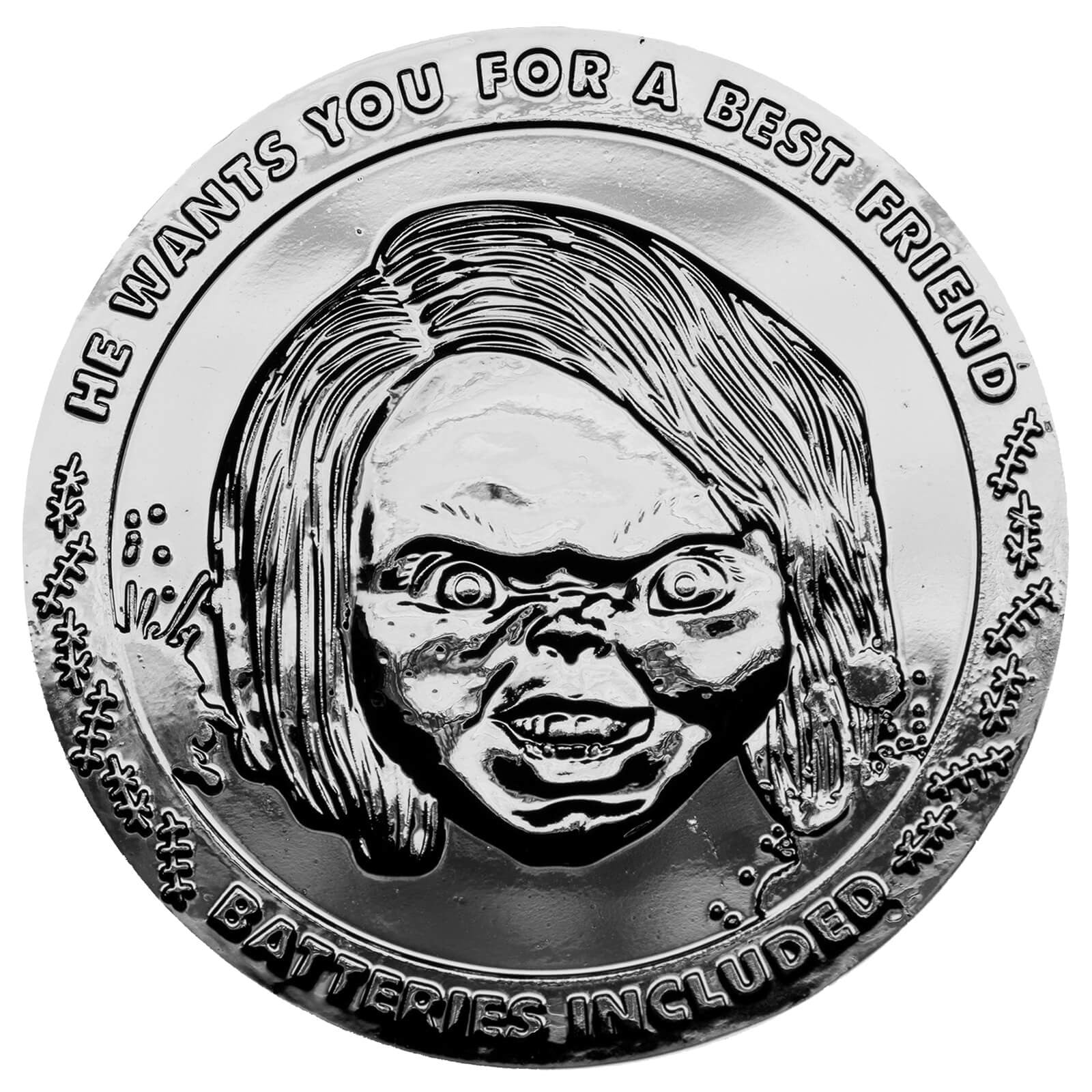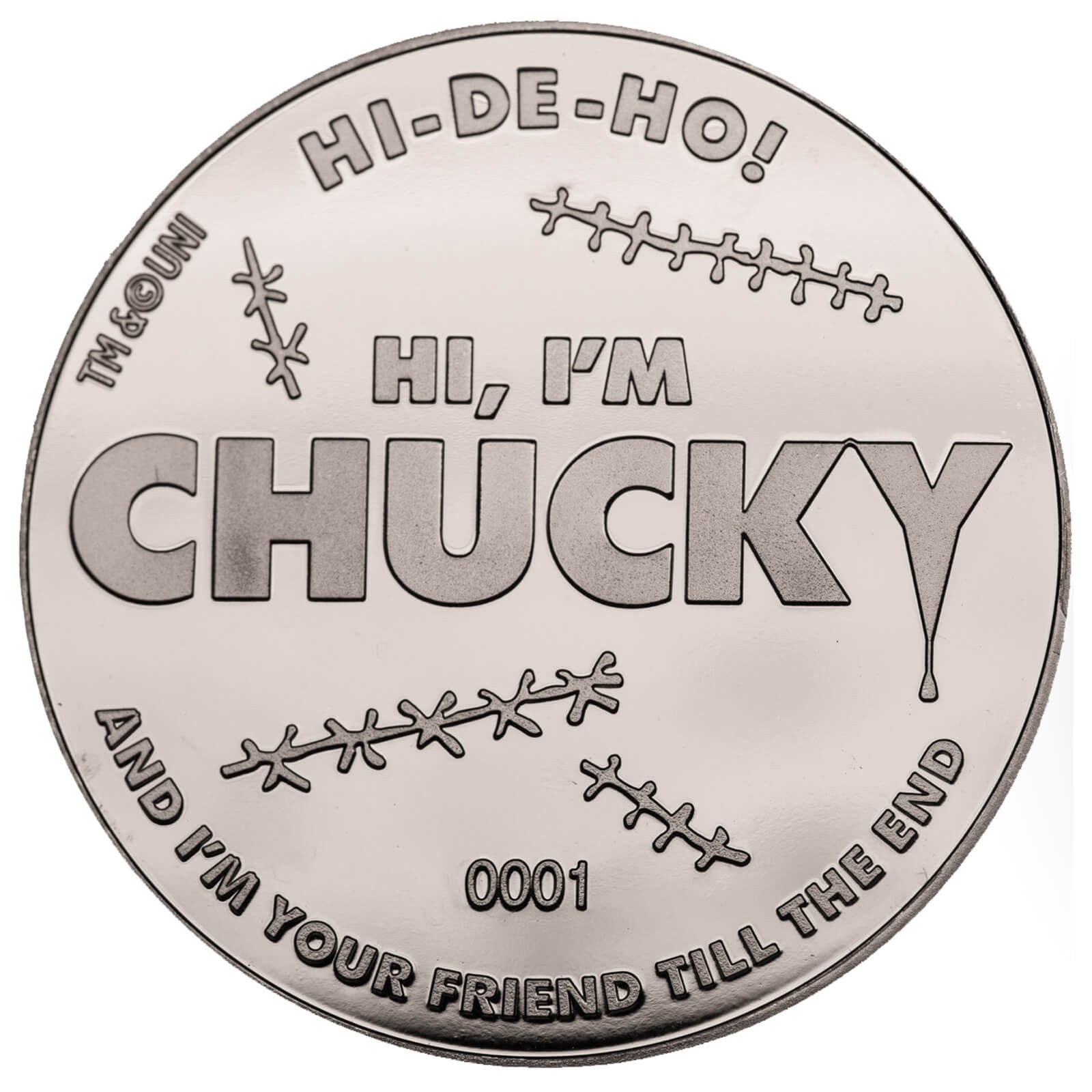 An amazing collectable item for any Chucky fan or a valuable addition to any collector’s collection. This heavy weight limited edition Silver variant collectible coin is officially licensed by Universal Studios. Each coin is embossed on both sides and individually numbered.