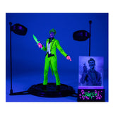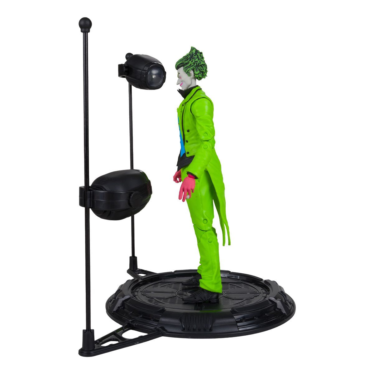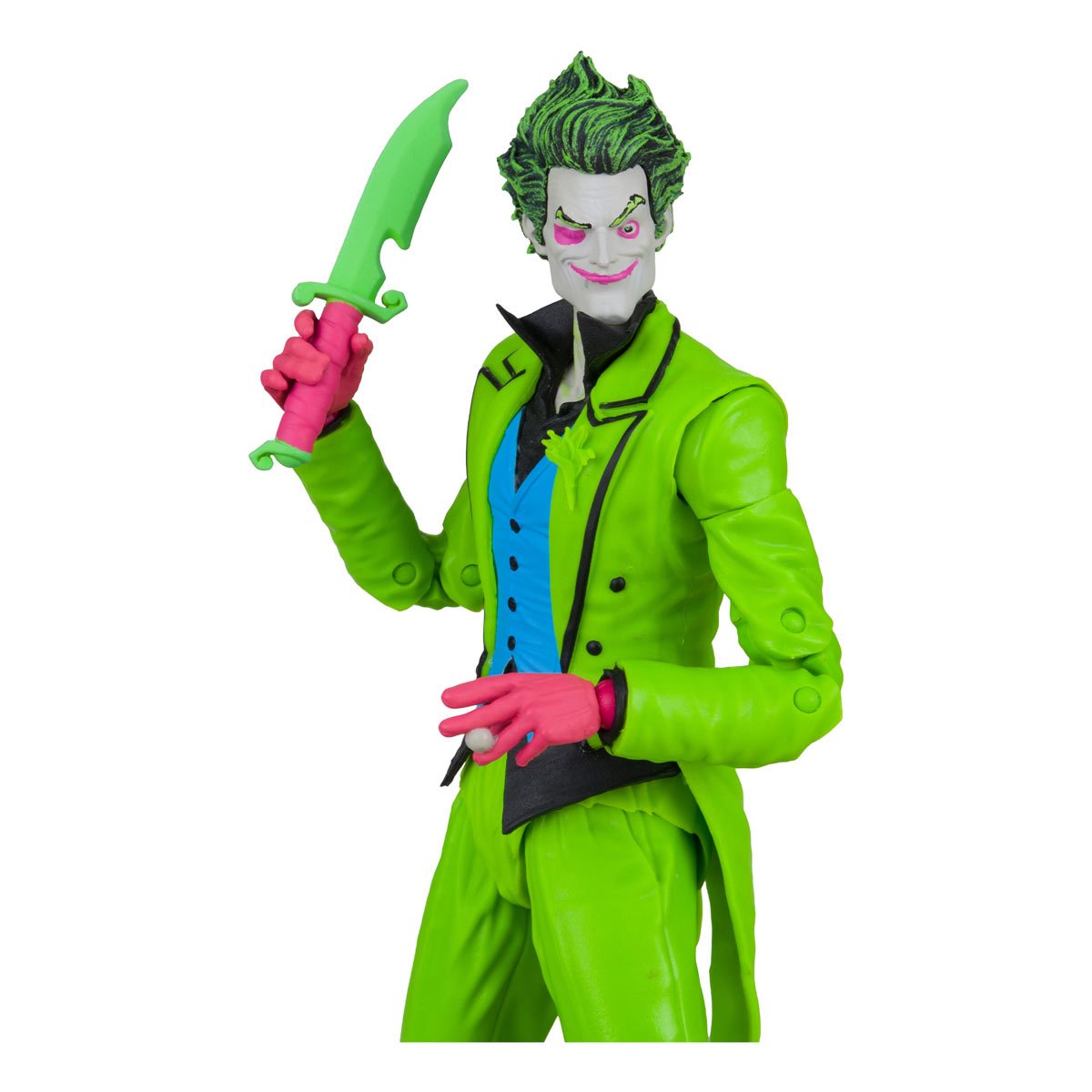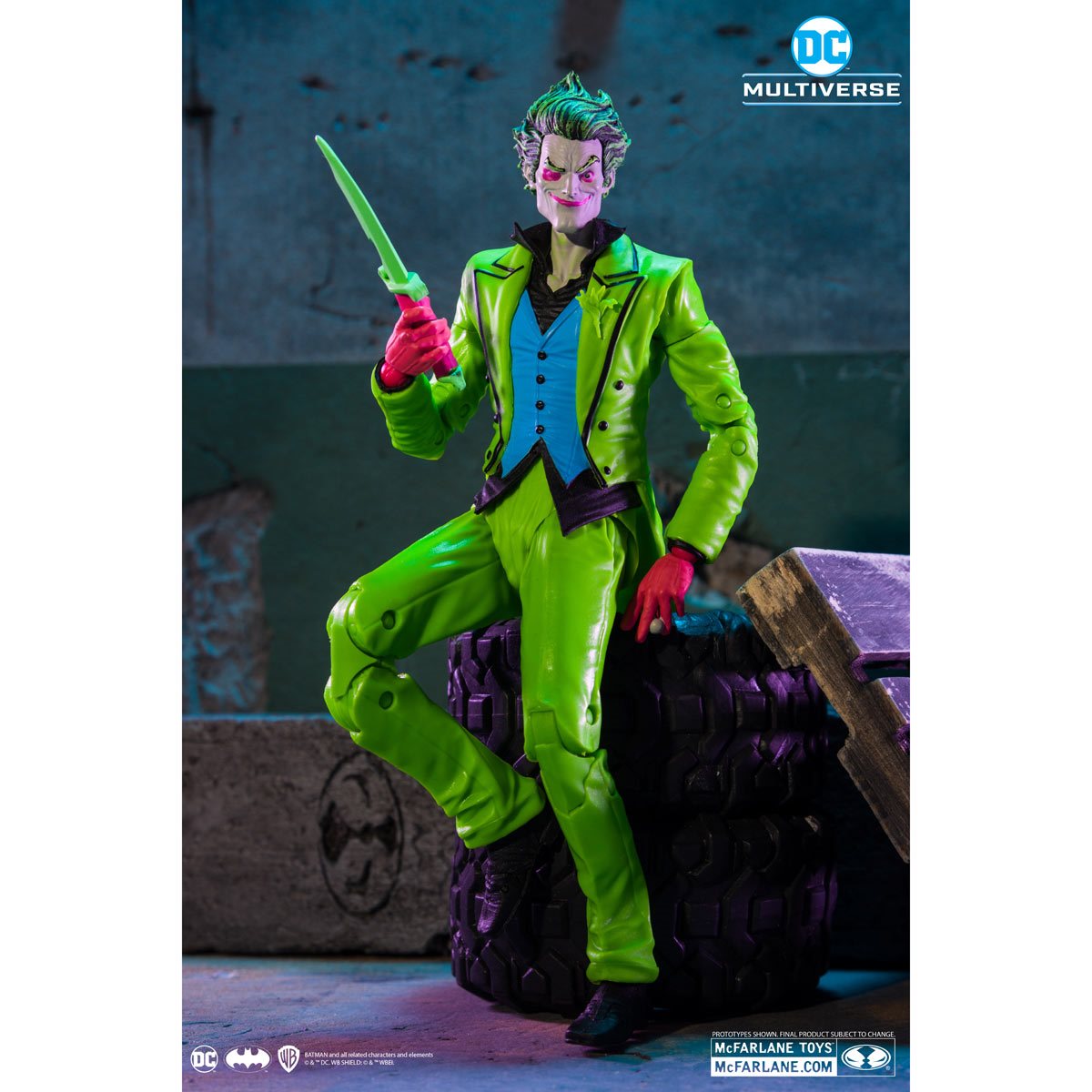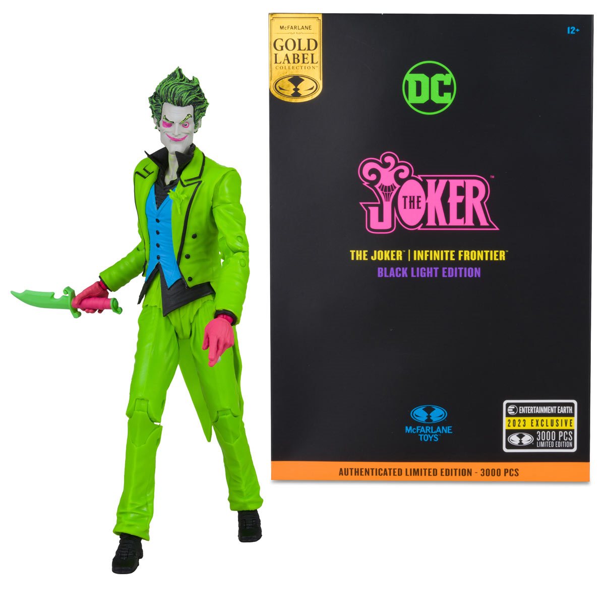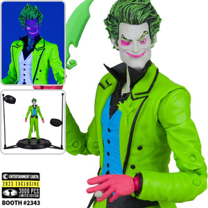Entertainment Earth Exclusive! With an unhinged grin, The Joker grabs the spotlight! Based on his comic look from Infinite Frontier, the crazed clown features an exclusive, eye-popping black-light deco. Joker includes a knife accessory, an exclusive card stand, and a base with 2 battery-powered black lights. Also included is a collectible art card with a Joker illustration on the front and a certificate of authenticity on the back. Fully articulated, the vivid Clown Prince of Crime stands approximately 7-inches tall and comes in deluxe packaging. He's limited to 3,000 pieces, so you'll need to catch this vibrant villain while you can. Batman doesn't stand a chance against this DC Multiverse The Joker Infinite Frontier Black Light Gold Label 7-Inch Action Figure - Entertainment Earth Exclusive! Ages 12 and up.