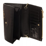 Do you solemnly swear that you are up to no good? Make sure your Marauder's Map never leaves your side - keep it in this Mischief Managed Fold over clutch! The black PU exterior features a metallic gold "Mischief Managed" script and stars print, plus gold-tone studs and removable gold-tone chain cross body strap. The interior features card slots, bill slot, and an ID window.