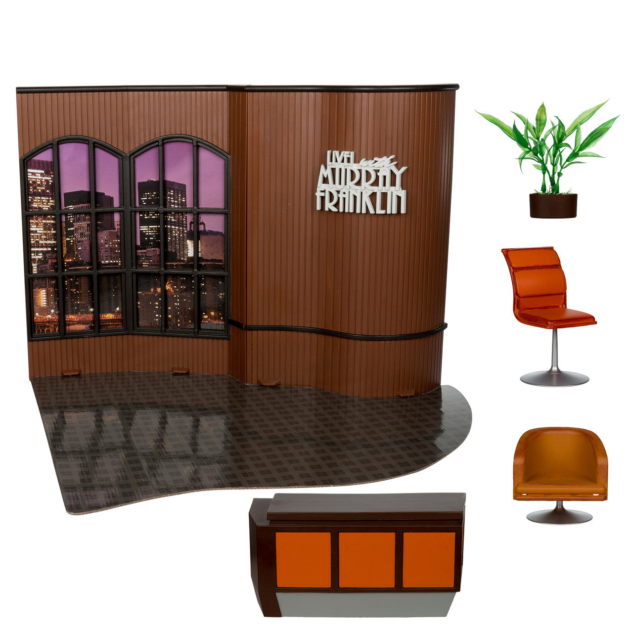 • Diorama set features Live with Murray Franklin backdrop and floor, host desk, 2 chairs, mug, microphone and plant.
