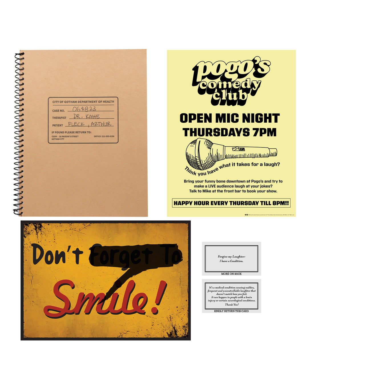 • Also includes life size prop replica items: Joker notebook, "Don't Forget to Smile" sign (metal), Open Mic Night poster (paper), and Forgive my Laughter (card stock).