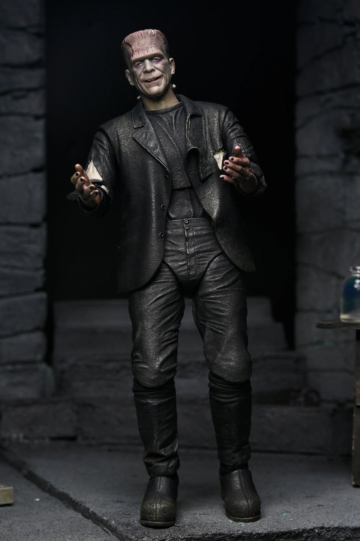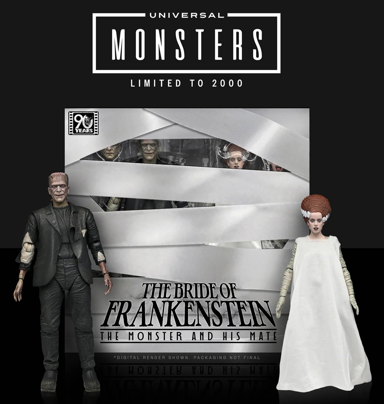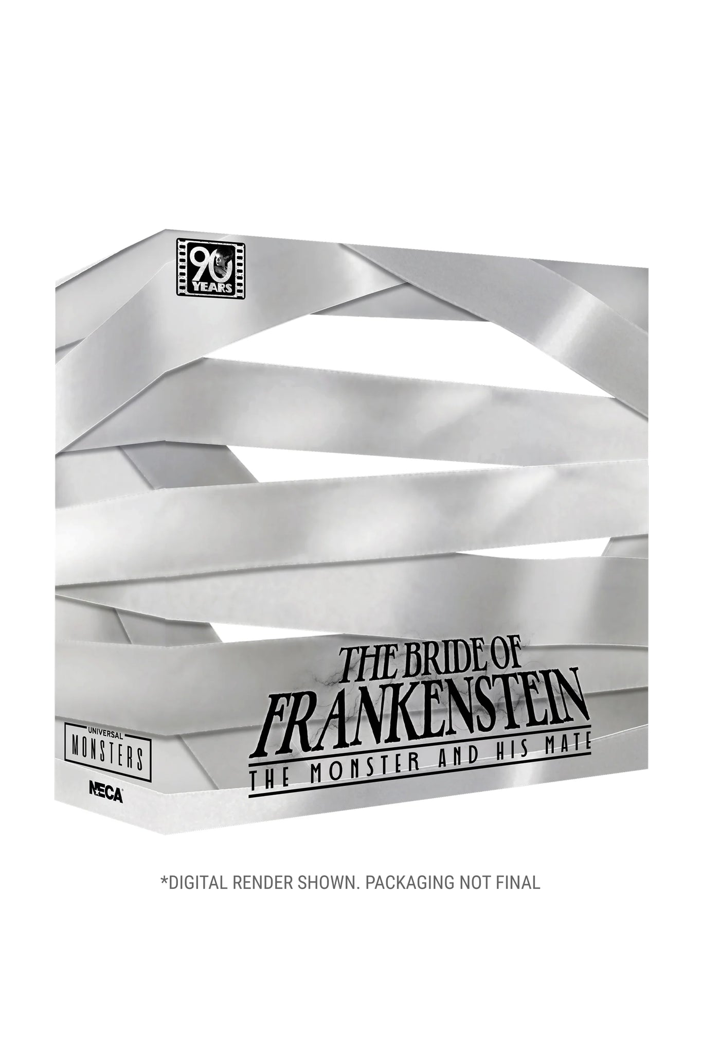 "We belong dead..." Celebrate 90 years of classic horror and doomed romance with this haunting tribute to the classic Universal Monsters film, The Bride of Frankenstein! NECA proudly presents The Monster and His Bride, a commemorative action figure 2-pack that brings Frankenstein’s Monster and his Bride together in one electrifying collector’s set. When the Monster meets his true love and finds that his feelings are unrequited, he flips the switch that implodes the castle—ending their tragic love story before it even begins. These screen-accurate, 7-inch scale figures include multiple interchangeable heads and hands, and a soft goods robe for the Bride. Bring home this infamous couple, together at last in limited-edition window box packaging with slipcover.